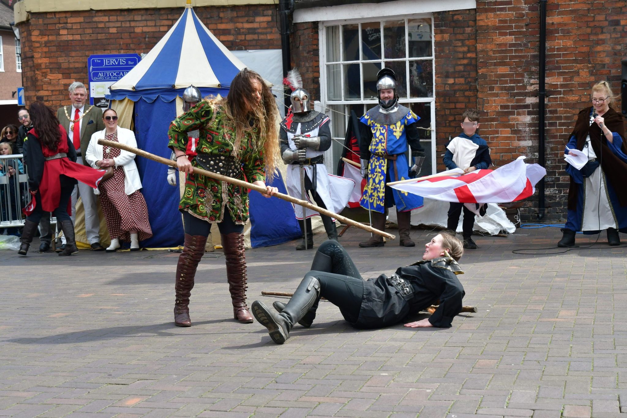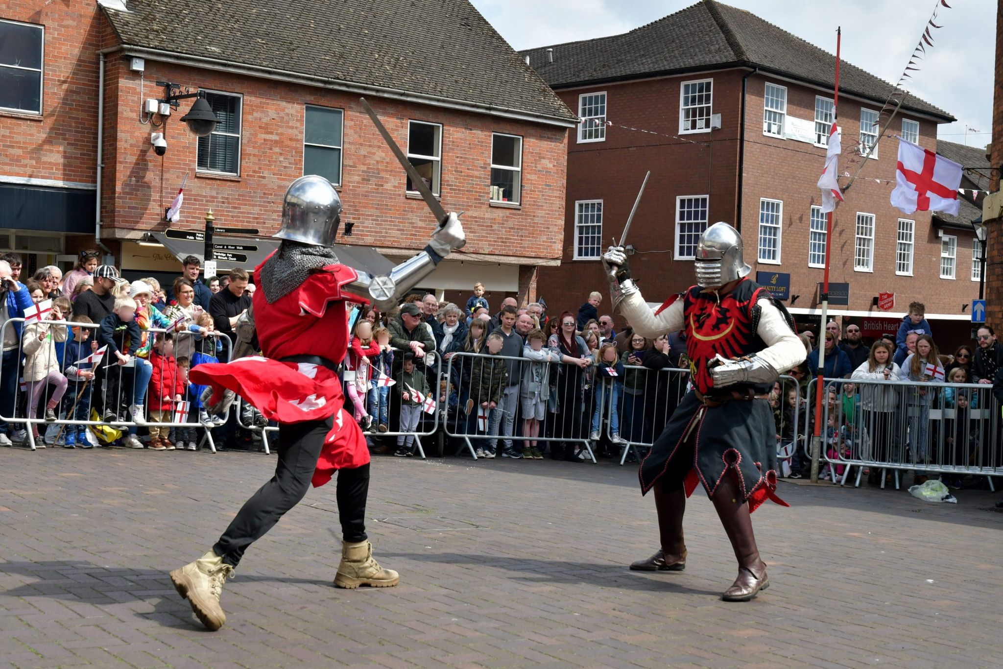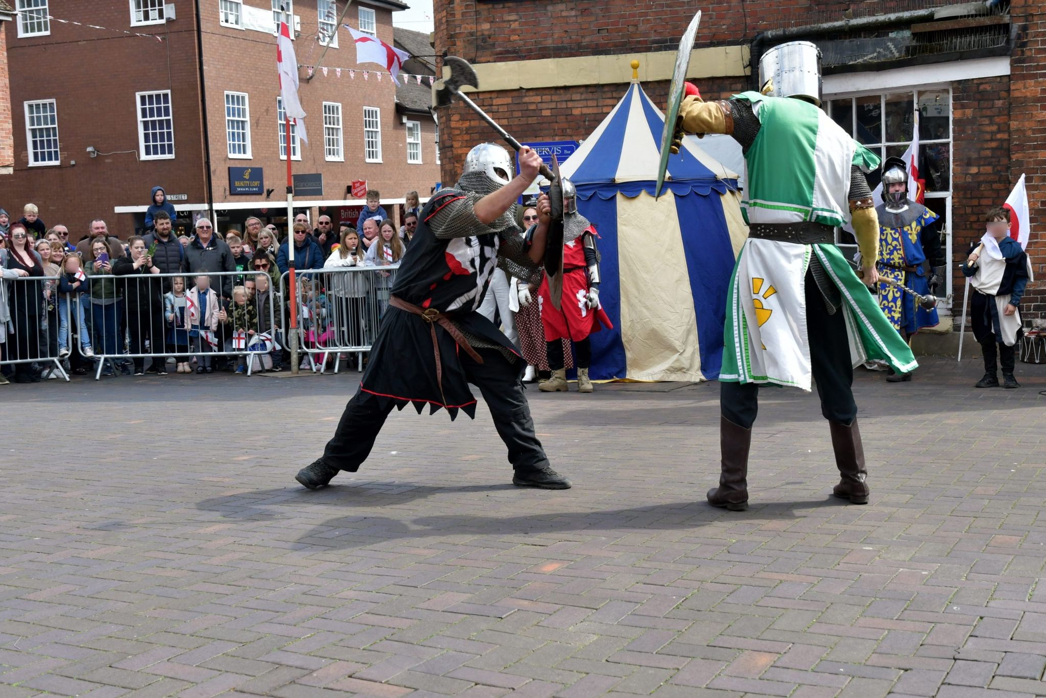 The event began with a parade at 1:00 pm down the High Street to Market Square led by Saint George on horseback and children were invited to join in. Once in the Market Square, the Black Knights fought Saint George and his men in front of the assembled crowd.